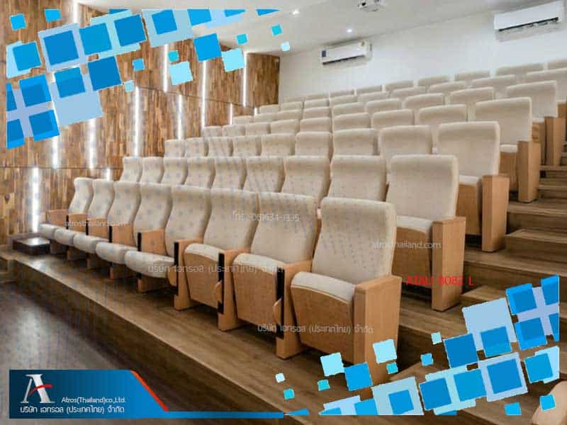เก้าอี้หอประชุม หรือ เก้าอี้โรงหนัง เป็นเบาะโพลี่ยูรีเทน ฉีดขึ้นรูปลักษณะแบบเดียวกับเบาะรถยนต์ (Flexible Polyurethane foam) สามารถยืดหยุ่นคืนกลับสภาพเดิมได้ดี (Flexible Polyurethane foam) หุ้มด้วยผ้า หรือหนัง เลือกสีได้ ด้านหลังหรือด้านล่างครอบด้วยพลาสติกฉีด เบาะนั่งมีกลไกพับกระดกเก็บได้ การพับเก็บมีโช๊ตอัพแบบ slow closing ลดเสียงรบกวนจากพับเก็บที่นั่งจากการลุกเข้าออกของผู้ใช้งาน มี Option ปิดปิดหลังพนักพิง ปิดด้านล่างที่นั่งด้วยไม้อัดวีเนียร และ/หรือ ท้าวแขนเป็นไม้จริงทำสีไม้ เคลือบผิวด้วยโพลี่ยูริเทน Hi-gloss สามารถเลือกสีไม้ได้ และหรือ